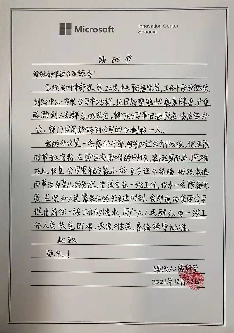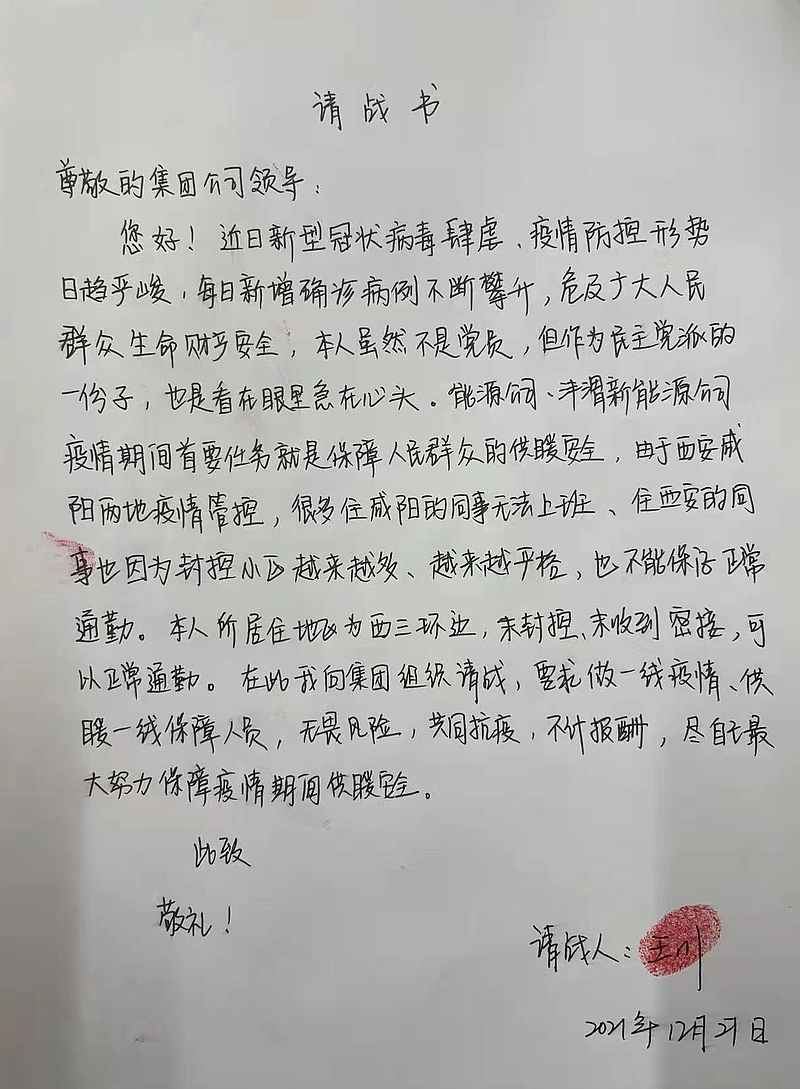 “本人居住小區(qū)未被封控,可以保證正常通勤,我向組織請(qǐng)戰(zhàn),要求做一線防疫、供暖保障人員,無(wú)畏風(fēng)險(xiǎn)、不計(jì)報(bào)酬!”這是一名80后員工,她叫王川,是灃西集團(tuán)下屬子公司能源公司的一名員工,在防疫工作開始后,她一貫沖在前干在前,值班時(shí)總是要求第一班。為了讓其他同事可以休息,可以輪休的情況下依然堅(jiān)持每天到公司到崗上班,保證工作不斷檔。公司在防疫執(zhí)勤點(diǎn)排班時(shí)主要安排男同志,但身為女同志,她多次申請(qǐng)前往一線。12月27日,在全市新一輪核酸檢測(cè)行動(dòng)開始前,王川同志主動(dòng)手寫請(qǐng)戰(zhàn)書,再次要求到一線防疫!目前在灃西新城馬王村開展防疫工作。