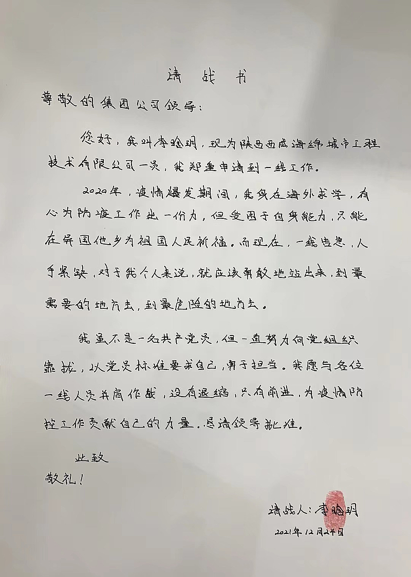“我是土生土長(zhǎng)的灃西人,對(duì)附近村子情況比較了解,我申請(qǐng)出戰(zhàn)抗疫一線!”“作為一名共青團(tuán)員,深知此次防疫責(zé)任重大、人員緊缺,我堅(jiān)決服從組織調(diào)配!”“來(lái)到公司剛好三個(gè)月,期間感受到了組織的溫暖,現(xiàn)在組織需要我,我申請(qǐng)出戰(zhàn)!”“我曾參與2020年疫情防控工作,對(duì)防疫工作比較熟悉,能夠更快進(jìn)入工作狀態(tài),請(qǐng)組織批準(zhǔn)出戰(zhàn)!”........