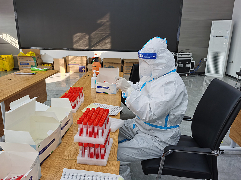 王穩(wěn)權(quán)配合醫(yī)護(hù)人員進(jìn)行采樣管分組