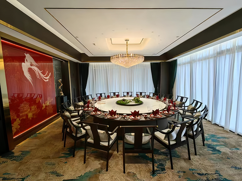 餐廳大小包間一應(yīng)俱全,以關(guān)中八景雁塔晨鐘、驪山晚照、曲江流飲、太白積雪、草堂煙霧、咸陽古渡等命名,以詩情畫意傳遞關(guān)中地區(qū)的錦繡河山。