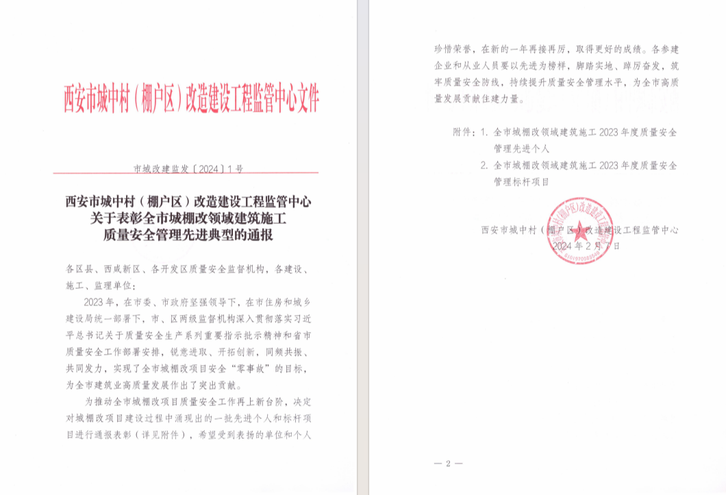 近日,西安市城中村(棚戶區)改造建設工程監管中心發布了《關于表彰全市城棚改領域建筑施工質量安全管理先進典型的通報》,灃西集團建設的江渡新苑南區項目獲評“全市城棚改領域建筑施工2023年度質量安全管理標桿項目”榮譽稱號。項目建設伊始,灃西集團就以現場安全文明建設為主線,貫徹落實“安全第一、預防為主、綜合治理”總方針,按照“五查四會三卡兩課一...